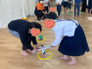 2本の棒を2人で持ち、お花や桜餅を挟んで移動させるゲームをしました🌷